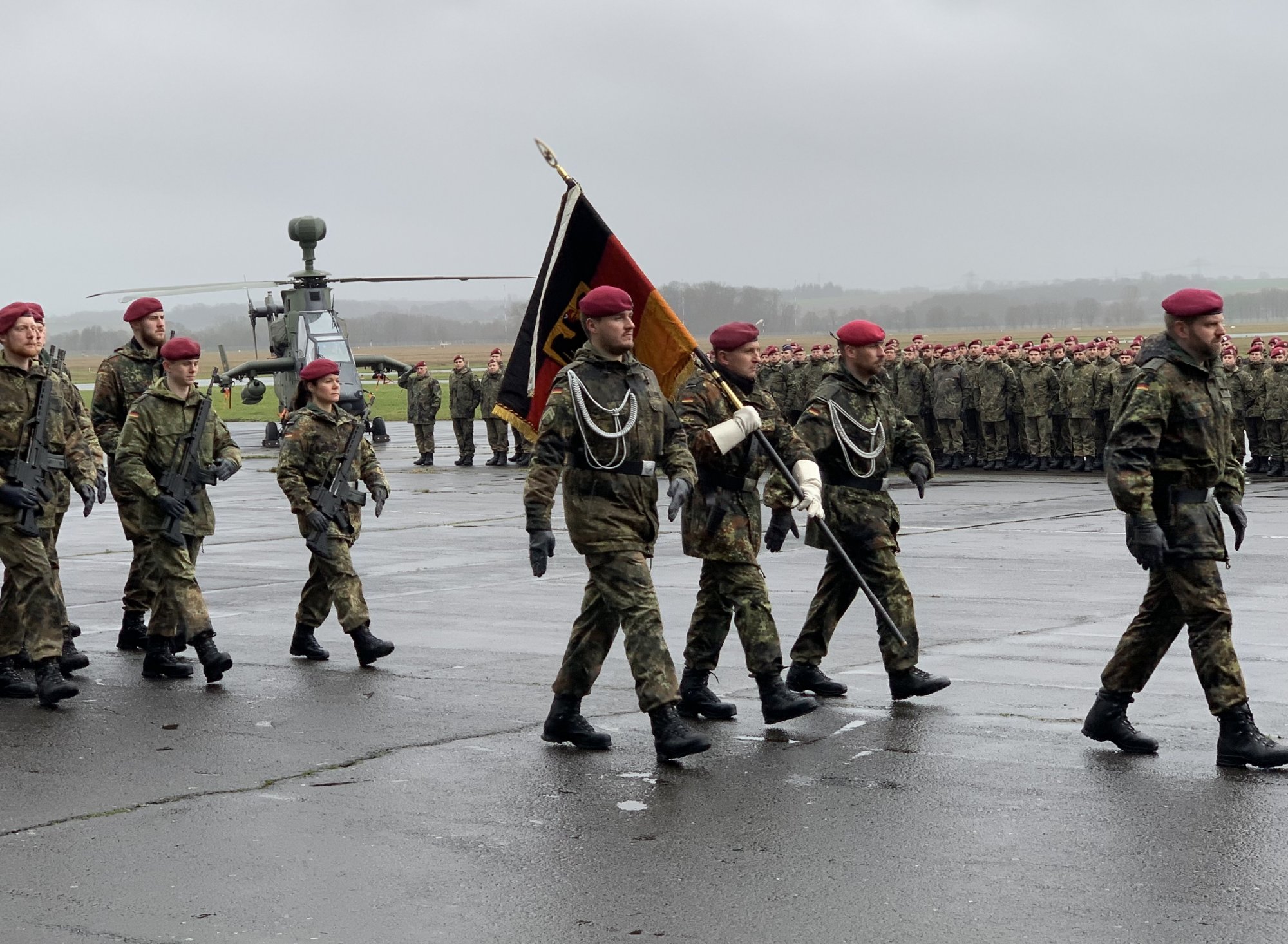 Der Einmarsch der Truppenfahne des Kpf-HubschrRgt 36, die Reden des Brigadegenerals Ott, von Oberst Schmuck sowie des Generalmajors Faust (Kdr DSK) beeindruckten die geladenen Gäste, die trotz schlechten Wetters zahlreich erschienen waren.